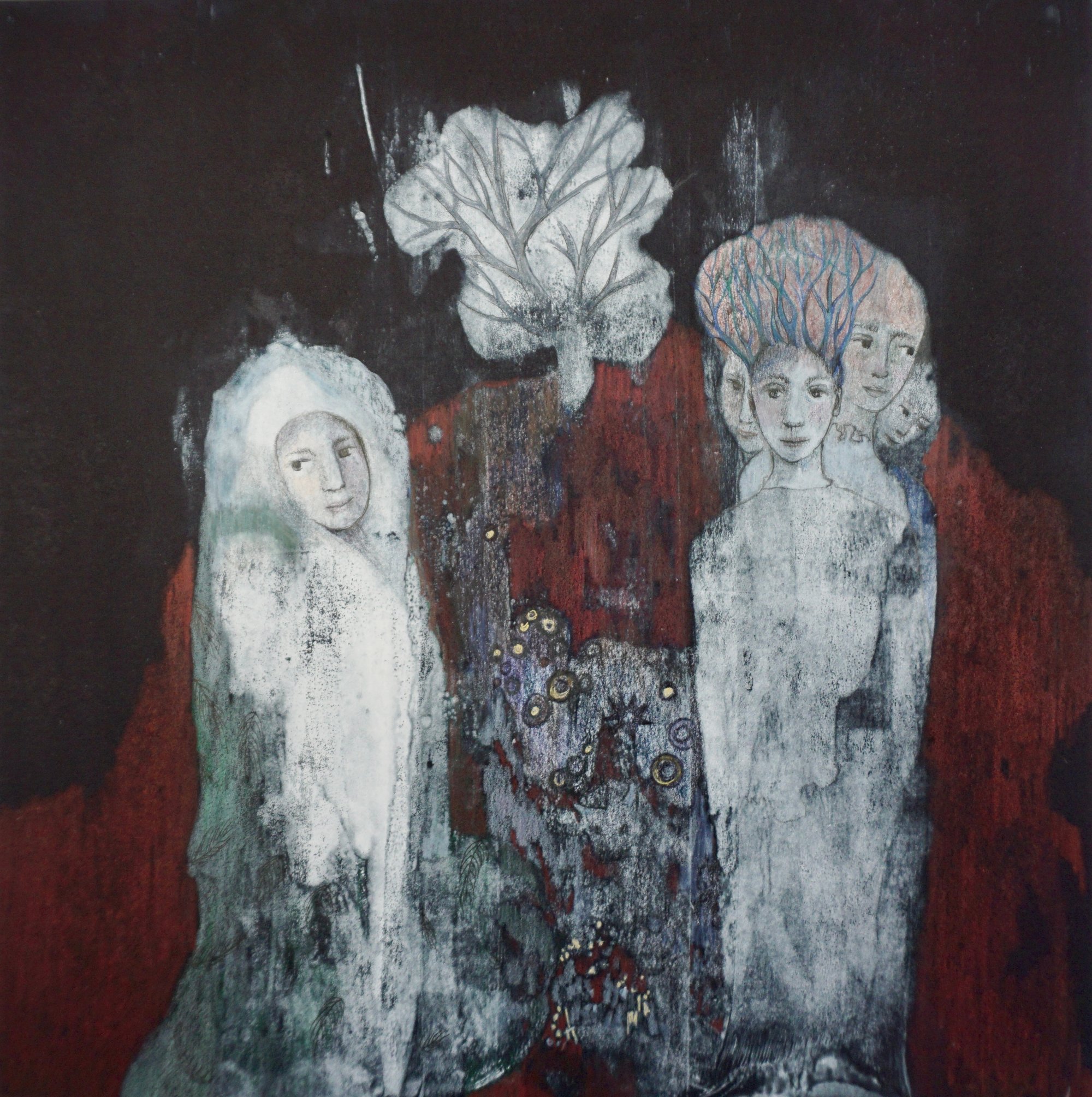 Epreuve unique de Jocelyne Besson Girard Monotype – rehaut crayons de couleur 30X30 – 50X50 cm encadré Cadre noir avec passe partout blanc.