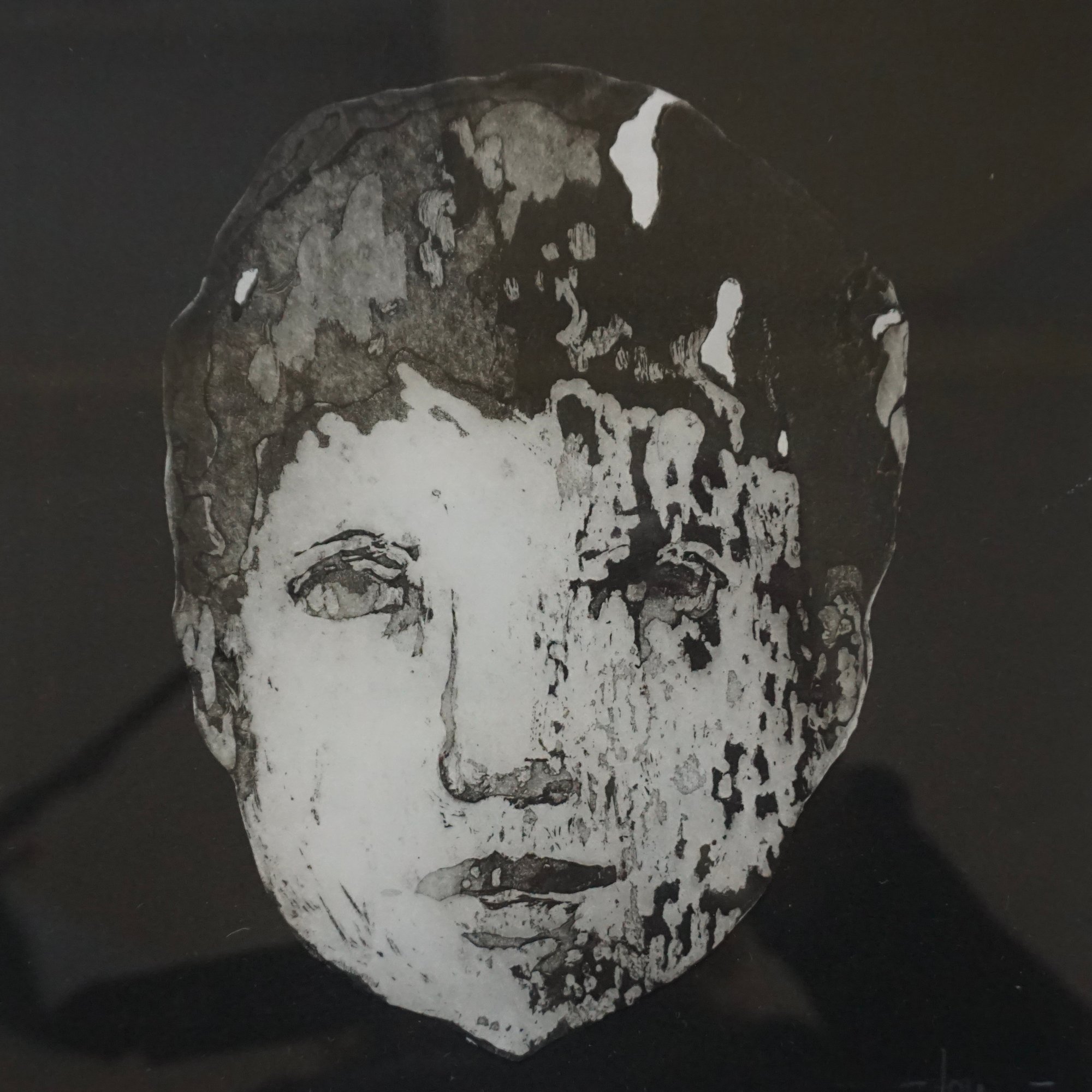 Gravure, collage de Jocelyne Besson Girard 20X20 – 30X30cm encadré Cadre noir avec passe partout blanc.